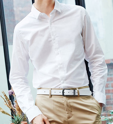 襯衫搭配休閑褲。休閑褲子顏色較多,尤其米白色的休閑褲子,襯衫與米白色休閑褲進行搭配,越顯洋氣、時尚。整體給人感覺干凈、清爽、休閑,同時又不失品味與時尚。男生穿著一件白色襯衫,搭配一個件米白色的休閑褲子,更顯陽光。