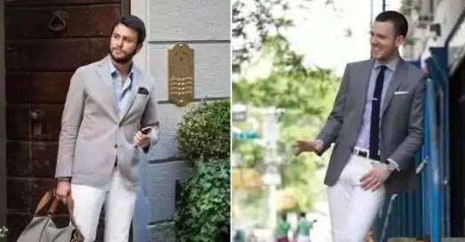 1、灰色、米白色/白色西服外套搭配白色的休閑長褲和德比鞋,不僅能營造清爽視覺,明亮色系的下身也能有效拉長腿部比例。以白色休閑長褲和襯衫為基礎,展現率性的意大利型男的味道。