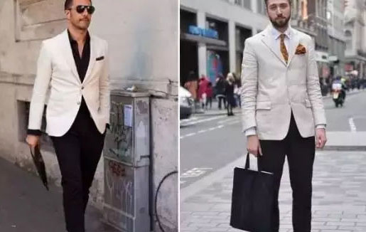 4、白色單西+黑色休閑褲子,這是經典的休閑紳士風范。黑白配永遠是經典搭配,米白色比起純白色更顯柔和,上身白色也有拉長的效果。