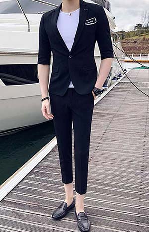 黑色是一種時尚的代表,這種款型的西服適合春夏穿著,韓版設計,修身休閑、是比較帥氣的小西裝,時尚挺括的版型西服,塑造紳士形象,而且這種顏色是適合出現比較多的場合。