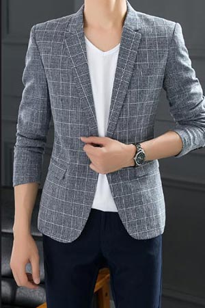 不是所有的西裝都要求配套的,即上衣和褲子同一顏色。這款灰色格子上衣內搭白色T恤在搭配黑色的褲子,外飾上配上手表,也是相當帥氣休閑的穿著,人顯得也比較精神,充滿陽光活力。這種穿著搭配不比傳統統一配套的西裝差。