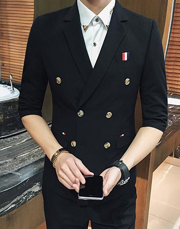 雙排扣英倫風格的中袖西裝內搭襯衫也是一直時尚的穿著,衣領處配置金屬材質的飾品作為點綴,讓白色襯衫不再普通。這類七分袖的雙排扣西裝也是現在比較流行的款式。